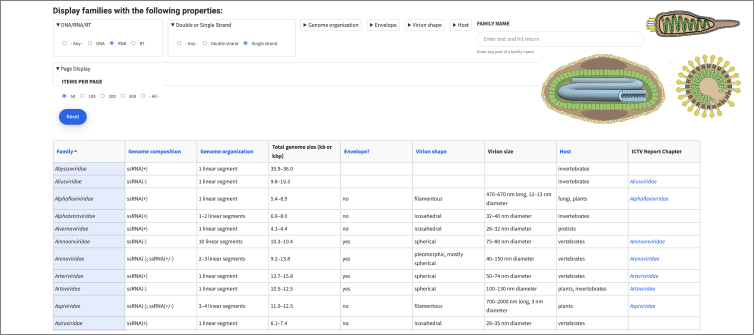 The Virus Properties table provides a sortable, filterable table listing the properties of the viruses that belong to each ICTV family. Included are genome composition, organization, and size; virion shape, size, and if it is enveloped; and host range.