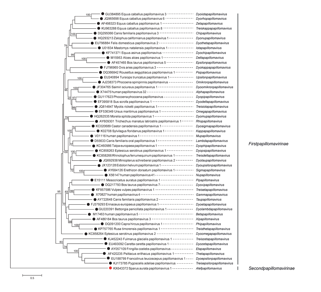 Phylogenetic analysis of papillomaviruses based on the concatenated alignment of four coding sequences (E1, E2, L2, and L1) from isolates from the type species of each of the  53 genera (Figure 4. Papillomaviridae) supports the existence of at least two distinct subfamilies (Firstpapillomavirinae and Secondpapillomavirinae). Likewise, this phylogeny, and that of an analysis of all 133 species (tree available in Resources), corroborates many genera and species within the Firstpapillomavirinae. However, not all genera or species are equally supported. There may be a need in the near future to base the taxonomy of the Papillomaviridae on the phylogenetic tree.