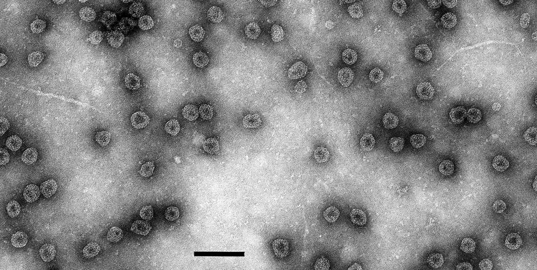 Negative contrast electron micrograph of particles of an isolate of Raspberry bushy dwarf virus, stained with uranyl formate/sodium hydroxide. The bar represents 100 nm.