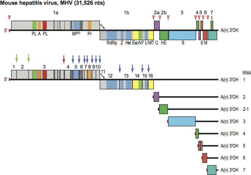 Figure 1 Coronavirus genome organization and expression. (Upper panel) Schematic representation of the genome of mouse hepatitis virus (MHV) shown as an example. ORFs are represented by boxes, indicated by number (above) and encoded protein (acronyms below). Regions encoding key domains in replicase polyproteins pp1a and pp1ab are colour-coded with hydrophobic segments shown in dark grey. The 5-leader sequence is depicted by a small red box. The arrow between ORF 1a and 1b represents the ribosomal frameshifting site. The poly(A) tail is indicated by A(n). Red arrowheads indicate the locations of transcription-regulating sequences (TRSs). PL (green) papain-like proteinase 1 (PL1pro); PL (red), papain-like proteinase 2 (PL2pro); A, ADP-ribose-1phosphatase (macrodomain); Mpro, 3C-like main protease; Pr, noncanonical RNA-dependent RNA polymerase, putative primase; RdRp, RNA-dependent RNA polymerase; Z, zinc-binding domain; Hel, helicase domain; Exo, 3 to-5 exoribonuclease domain; N7, guanine-N7-methyltransferase; U, nidoviral uridylate-specific endoribonuclease (NendoU); MT, ribose-2-O-methyltransferase domain; HE, hemagglutinin-esterase; S, spike protein; E, envelope protein; M, membrane protein, N, nucleocapsid protein; I, internal ORF. (Lower panel) Processing of the replicase polyproteins and structural relationship between the genomic RNA and subgenomic mRNAs of coronaviruses. Arrows indicate cleavage sites for PL1pro (green), PL2pro (red) and Mpro (blue). The locations of the non-structural proteins (nsps) are indicated by their number (see also Table 2). mRNA species are numbered as by convention on the basis of their size, from large to small, with the genome designated as RNA1. For the sg mRNAs only ORF(s) that are translated are shown.