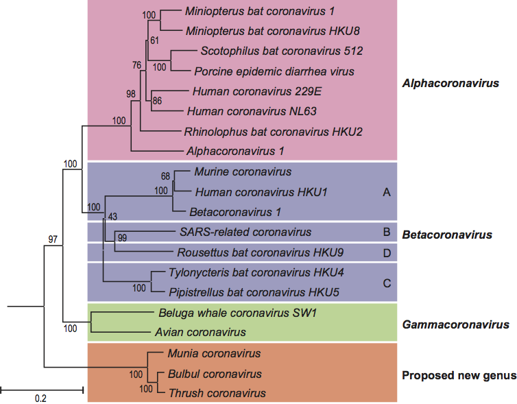 Figure 2 Phylogenetic relationships among the members of the subfamily Coronavirinae. A rooted neighbor-joining tree was generated from amino acid sequence alignments of RdRp and helicase domains with equine torovirus Berne as outgroup. The tree reveals four main monophyletic clusters corresponding to genera Alpha-, Beta- and Gammacoronavirus and an envisaged new genus (color-coded), and also shows the distinct betacoronavirus lineages A through D.