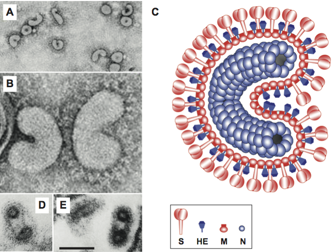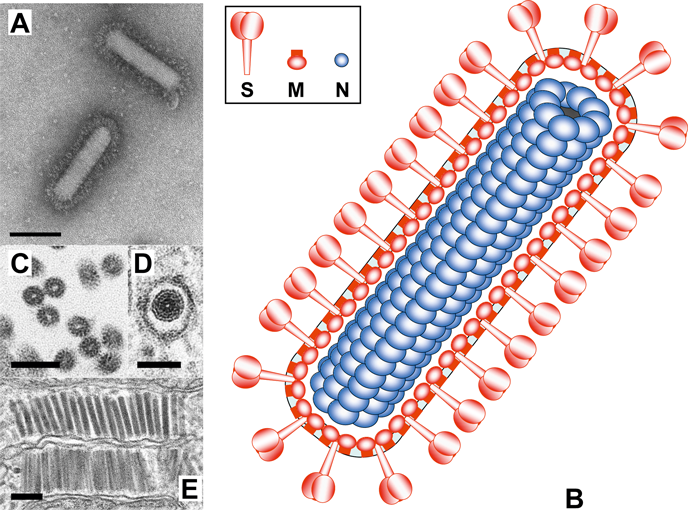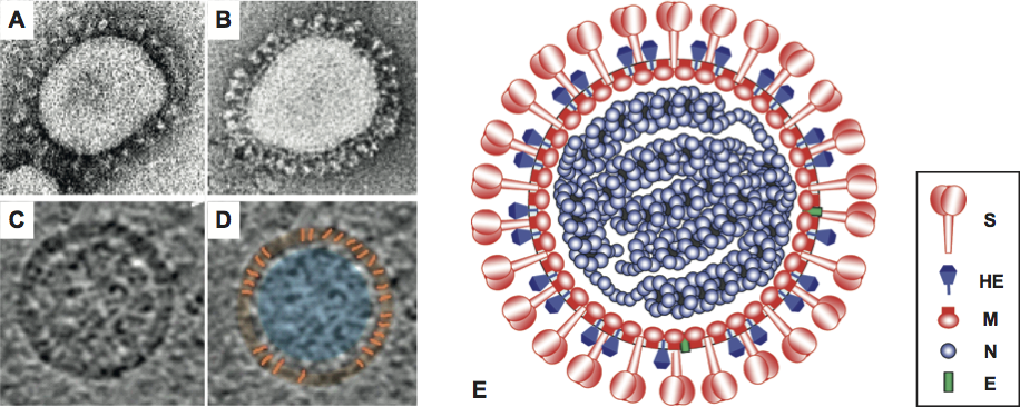 Figure 3 Coronavirus virion morphology. (A,B) Negative staining (2% phosphotungstic acid) electron micrographs of murine coronavirus particles. Shown are (A) a virion of murine coronavirus laboratory strain A59 that lacks HE expression and (B) one of a recombinant MHV-59 virus in which HE expression was restored (B) (courtesy Jean Lepault, Laboratory of Molecular and Structural Virology, Gif-sur-Yvette Cedex, France). (C,D) Cryo-electron tomographs of mouse hepatitis virus. A virtual slice (7.5 nm thick) through a reconstructed MHV particle (left) with highlighted features superimposed (right). The envelope is colored in orange with conspicuous striations highlighted; the nucleocapsid region is colored in blue. Note low-density region (ca. 4 nm) between envelope and nucleocapsid (reprinted with permission from Barcna et al. (2008) Proc. Natl Acad. Sci., U S A, 106, 582-587, 2008 National Academy of Sciences, USA). (E) Schematic representation of a (lineage A) betacoronavirus virion.