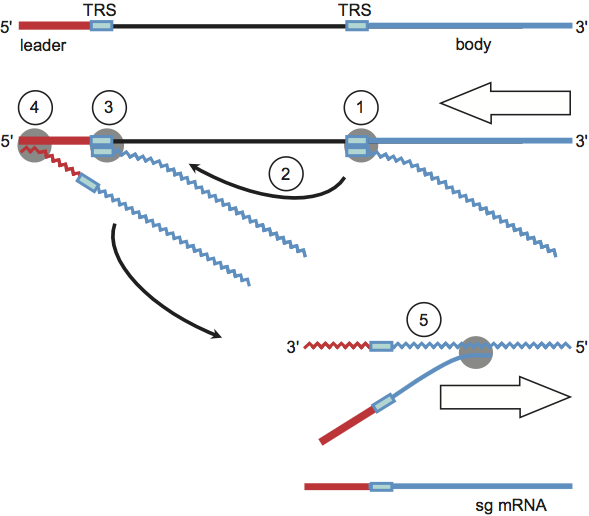 Figure 4 Coronavirus mRNA synthesis: the discontinuous 3-extension model. Minus-strand synthesis initiates at the 3 end of the genome and proceeds until a TRS is copied (1). The nascent minus-strand RNA may then be transferred to the 5 end of the genome (2). Base complementarity allows the minus-strand RNA to anneal to the leader TRS (3) after which RNA synthesis resumes and body (in blue) and leader sequences (in red) become fused (4). The chimeric sg minus-strand RNA in turn serves as a template for continuous synthesis of sg mRNAs (5).