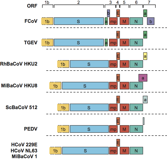 Figure 5 Alphacoronavirus genome organization. Comparison of the 3-terminal genomic regions downstream of ORF1b of alphacoronaviruses representative of the different species and subspecies. ORFs are depicted as coloured boxes and indicated by number (above) and encoded protein. ORFs for accessory proteins are named as by convention according to number (referring to the mRNA species from which they are expressed) and, in the case of multiple ORFs in one transcription unit, alphabetically. Conservation of genes is indicated by identical colouring. Accessory genes of different viruses that are located in the same genomic location but believed to encode non-related products are coloured differently. For the abbreviations of virus names, please see list of species in the genus Alphacoronavirus below. 1b, ORF1b; mp, alphacoronavirus-specific accessory membrane protein mp; all other acronyms as in Figure 1.