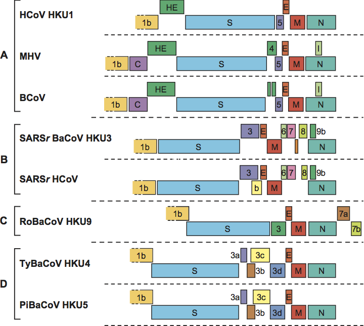 Figure 6 Betacoronavirus genome organization. Comparison of the 3-terminal genomic regions downstream of ORF1b of betacoronaviruses representative for the different species and subspecies. ORFs are depicted as boxes, color-coded and indicated by number and gene product as in Figure 5. For the abbreviations of virus names, please see the list of species in the genus Betacoronavirus.