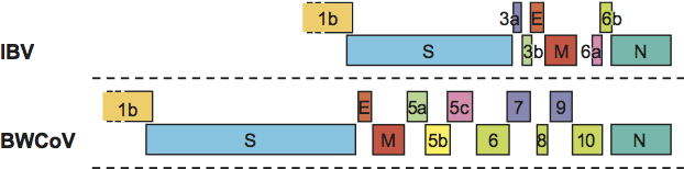 Figure 7 Gammacoronavirus genome organization. Comparison of the 3-terminal genomic regions downstream of ORF1b of infectious bronchitis virus (IBV; sp. Avian coronavirus) and Beluga whale coronavirus SW1 (BWCoV). ORFs are depicted as boxes, colour-coded and indicated by number and gene product as in Figures 5 and 6.