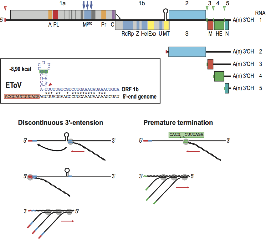 Figure 9 Organization and expression of the torovirus genome. (Upper panel) Schematic representation of the equine torovirus genome. ORFs and other genome elements are indicated as in Figure 1. The 5-leader sequence present in the genome and sg mRNA 2 is depicted by a small red box. Green and red arrowheads/boxes indicate the locations of the internal and the 5-terminal putative terminator/promoter (TP) elements, respectively. Blue arrows indicate established Mpro cleavage sites. The location of the discontinuous transcription element (DTE) driving mRNA 2 synthesis is shown by a hairpin. PL, papain-like proteinase; C, torovirus-specific ORF1a-encoded cyclic nucleotide phosphodiesterase domain. All other acronyms as in Figure 1. (inset) Structure of the mRNA 2 discontinuous transcription element, showing the hairpin structure and downstream homology region with sequence identity to the 5 end of the genome indicated by asterisks. A hairpin residue-pair displaying co-variation in BToV and PToV is highlighted in green. The site of mRNA 2 leaderbody fusion is indicated by an arrowhead. The 5-terminal genomic TP copy is highlighted by a red box. (Lower panel) Models for discontinuous (left) and non-discontinuous sg RNA synthesis (right) in toroviruses. The hairpin indicates the mRNA 2 DTE. Red boxes correspond to the 5-terminal genomic TP copy and complementary sequences, blue boxes to the DTE homology region and the corresponding 5 genomic acceptor sequence. The TP consensus sequence is shown and highlighted by a green box. Internal TPs and complementary sequences are shown in green. The models show (from top to bottom) synthesis of genome-templated minus-strand RNA (minus-strand RNAs indicated by a wiggly line), attenuation and 3-discontinuous extension directed by the DTE element and premature termination directed by internal TPs, and subsequent mRNA synthesis from sg minus-strand templates. Details are described in the text.