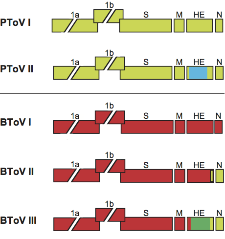 Figure 10 Genome organization of torovirus genotypes reveals evidence for multiple interspecies RNA recombination events. The genes for the replicase polyproteins (1a, 1b) and for the structural proteins S, M, HE, and N are depicted as boxes. For PToV, HE coding sequences are shown in different colors to indicate that one of the genotypes exchanged part of its HE gene through homologous RNA recombination with an as yet unknown torovirus. For BToV, sequences acquired from PToV (in yellow) and from a hitherto unidentified torovirus donor (in green) are also indicated.
