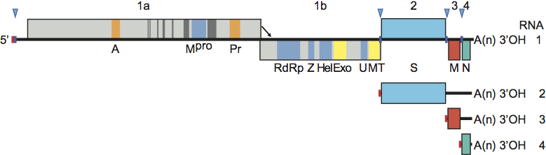 - Replicase gene: comprised of overlapping ORFs 1a and 1b that code for two huge polyproteins, pp1a and pp1ab, production of the latter requiring a programmed 21 ribosomal frameshift; pp1a and pp1ab are processed autoproteolytically.