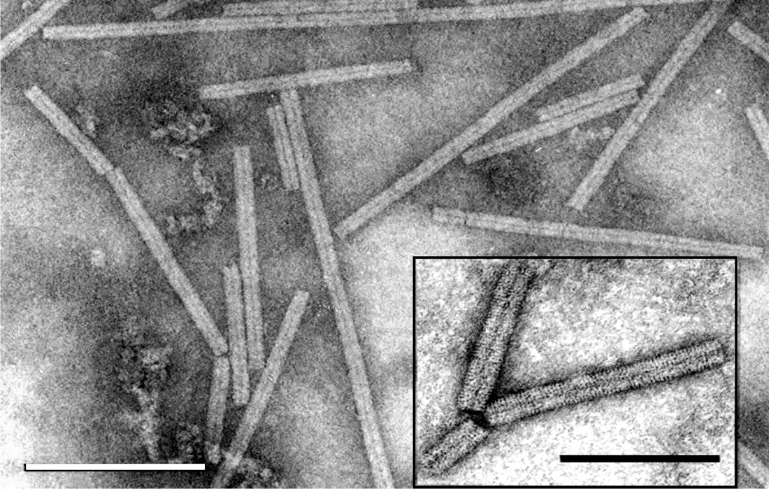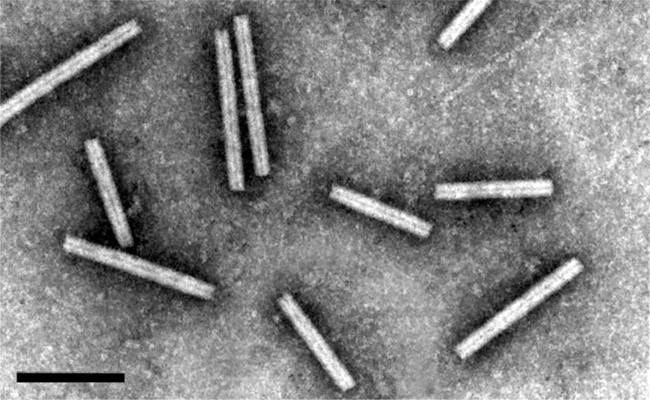 Virions are non-enveloped, elongated and rigid, about 20×110–150 nm in size; they are helically symmetrical with a pitch of 2.5 nm (Figure 4).