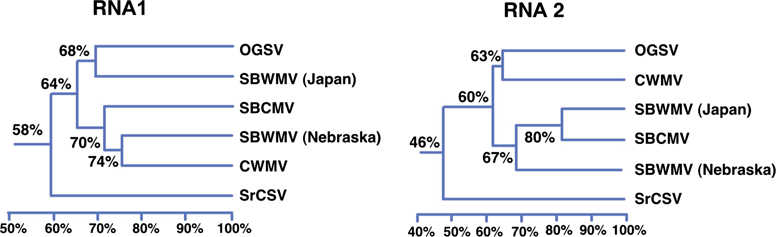 The species within the genus Furovirus are presently mainly differentiated on the basis of the nt sequences of their RNAs and the deduced aa sequences of their putative gene products. RNA-1 sequences of these viruses share 58–74% identity and RNA-2 46–80% (see Figure 3). SBWMV, SBCMV, CWMV and OGSV can be discriminated also by reactivity with selected monoclonal and polyclonal antibodies. OGSV and SrCSV differ in host range to SBWMV, SBCMV and CWMV. Especially the latter three viruses have similar biological properties and genetic reassortants can be formed with RNA-1 and RNA-2 of SBWMV (Nebraska), SBWMV (Japan) and SBCMV. With the other viruses this possibility has not yet been checked.