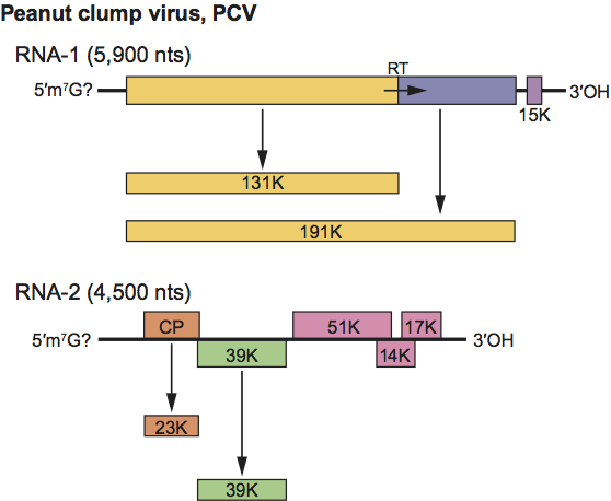 Figure 7 Genomic organization of peanut clump virus (PCV) RNAs. ORFs are indicated by rectangles and suppressible termination codon by an arrow (RT=readthrough).