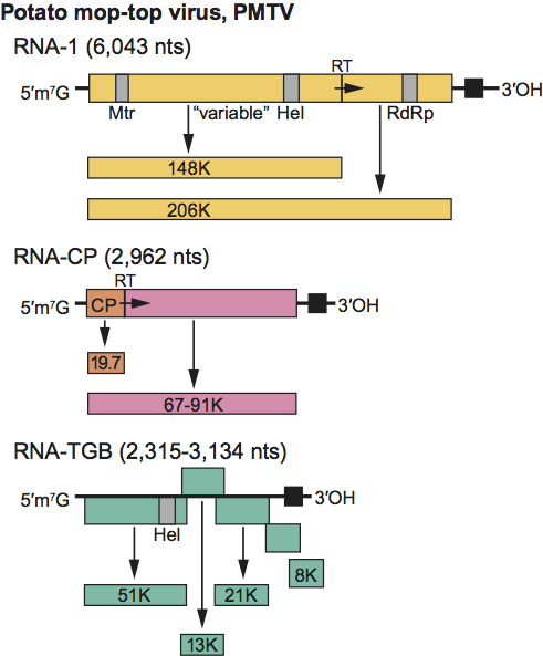 Figure 9 Genome organization typical of potato mop-top virus. Arrows indicate respectively the UGA and UAG stop codons that are thought to be suppressible, and solid squares indicate a 3-terminal tRNA-like structure. Hel, helicase; Mt, methyltransferase; RdRp, RNA dependent RNA polymerase; RT, readthrough.