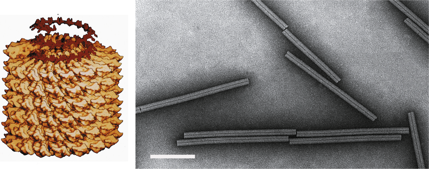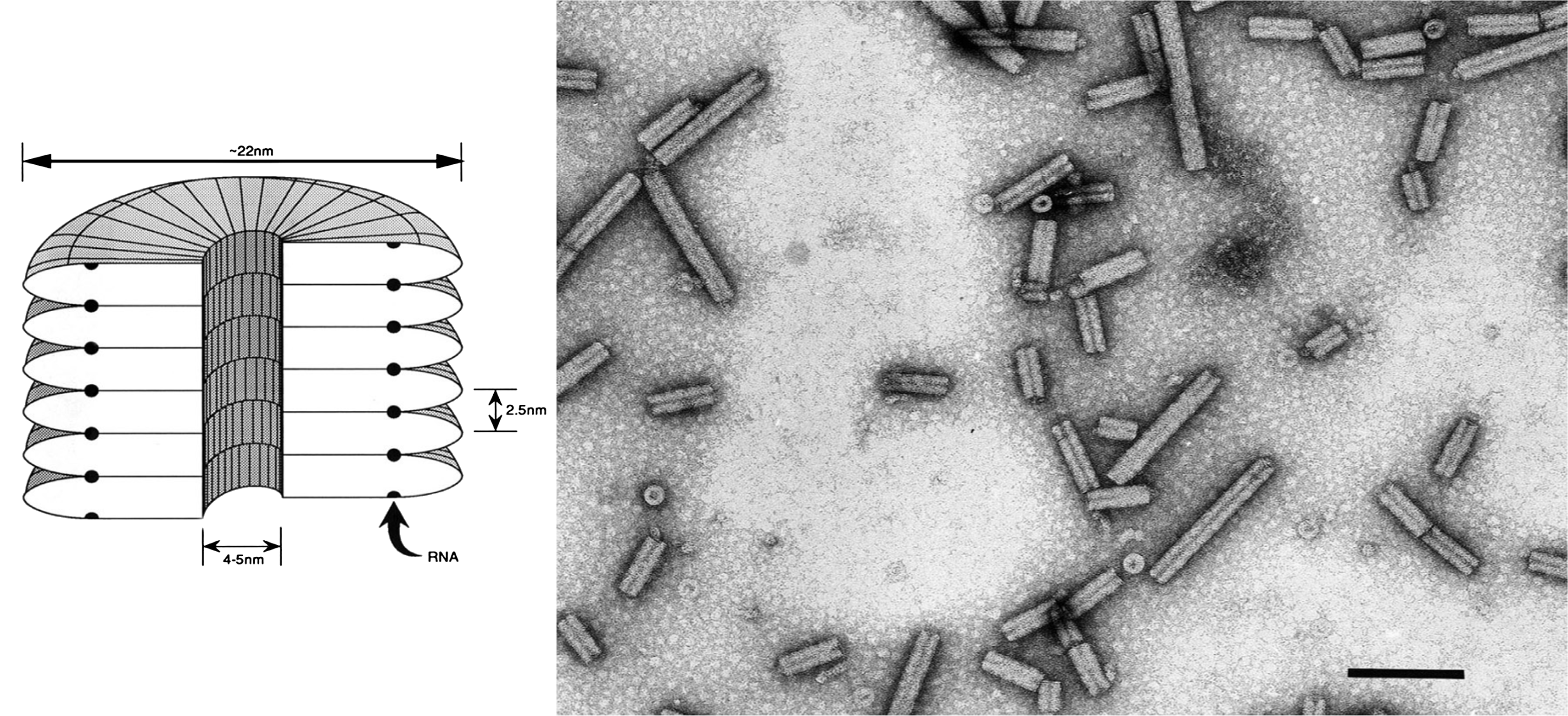 Figure 10 (Left) Model of particle of tobacco mosaic virus (TMV). Also shown is the RNA as it is thought to participate in the assembly process. (Right) Negative contrast electron micrograph of TMV particle stained with uranyl acetate. The bar represents 100 nm.