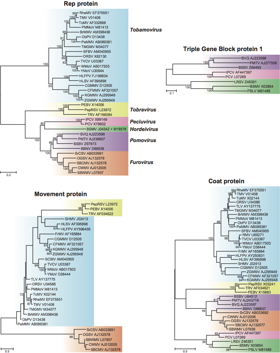 Best phylogenetic trees are obtained using the replication protein (or conserved domains within it) as these occupy the majority of the genome. However, the different genera usually separate reliably, regardless of the gene used (Figure 14). In both the replication protein and the coat protein, the monopartite genus Tobamovirus separates substantially from the remaining genera. Furovirus and Pomovirus occur together on the same branch in all trees as do Pecluvirus and Hordeivirus.