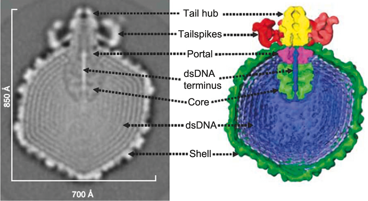 Heads are icosahedra with 60 hexamers and 11 pentamers, and measure about 70 nm in diameter in cryo-EM images. Tails are about 15 nm in length and there are six tailspikes (gp20) surrounding an external tail hub (17×14 nm; Figure 2).