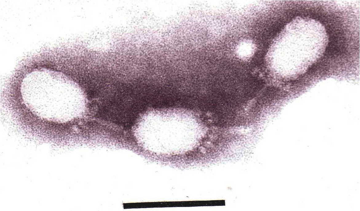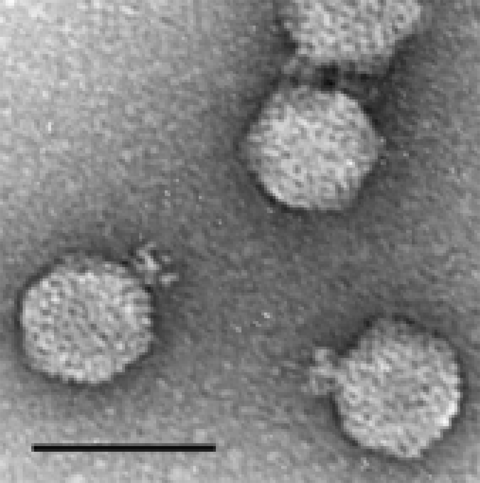 Virions have icosahedral heads about 70 nm in diameter and short tails 10 nm in length, with several short fibers originating from the junction between the head and tail (Figure 4).