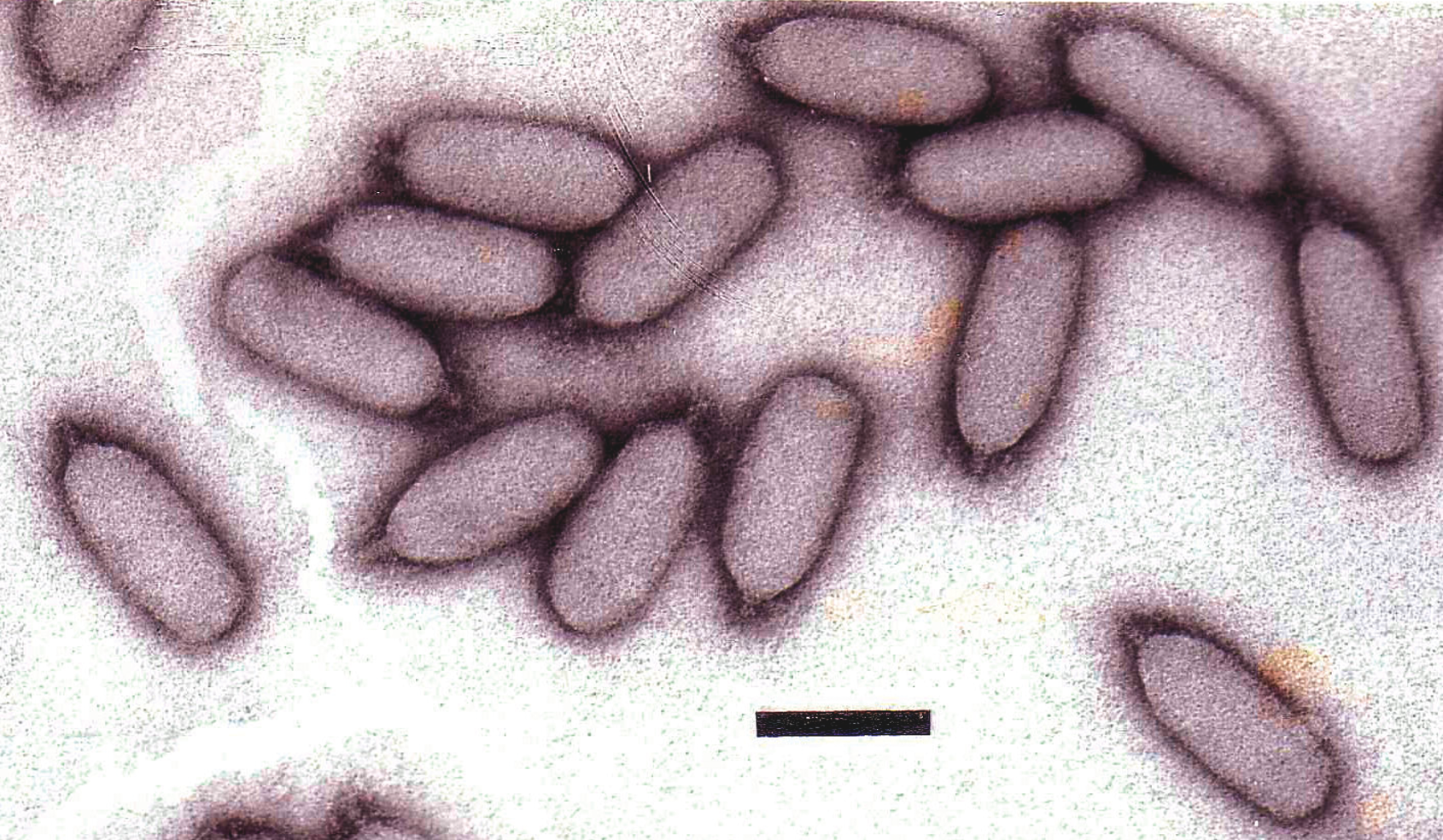 Figure 6 Electron micrograph of phiEco32 stained with phosphotungstate in the presence of bacitracin. The bar represents 100 nm.