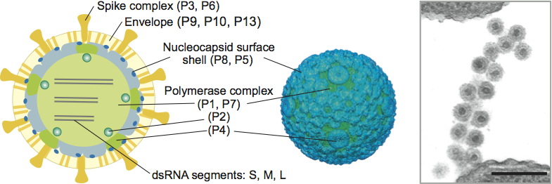 Figure 1 (Left) Schematic presentation of cystovirus particle (Pseudomonas phage phi6) with location of virion proteins. (Middle) Three-dimensional reconstructions of the nucleocapsid. (Right) Thin-section electron micrograph of Pseudomonas phage phi6 particles attached to the pilus receptor. The bar represents 200 nm.