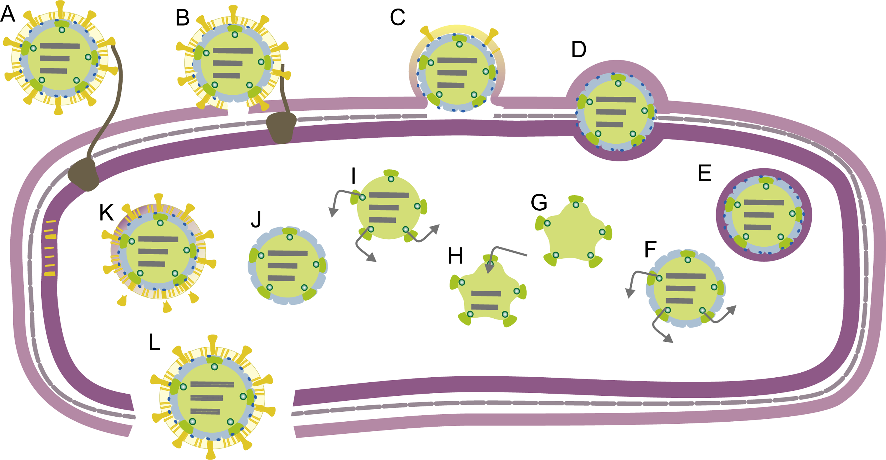 Figure 3 Schematic of the Pseudomonas phage phi6 life cycle. (A) Adsorption. (B) Envelope fusion. (C) Peptidoglycan digestion. (DE) Endocytotic uptake of nucleocapsid. (F) Early transcription. (G) Polymerase complex assembly. (H) ssRNA packaging and replication. (I) Late transcription. (J) Nucleocapsid shell assembly. (K) Translocation of the viral envelope and assembly of spikes. (L) Host cell lysis and release of mature virions.