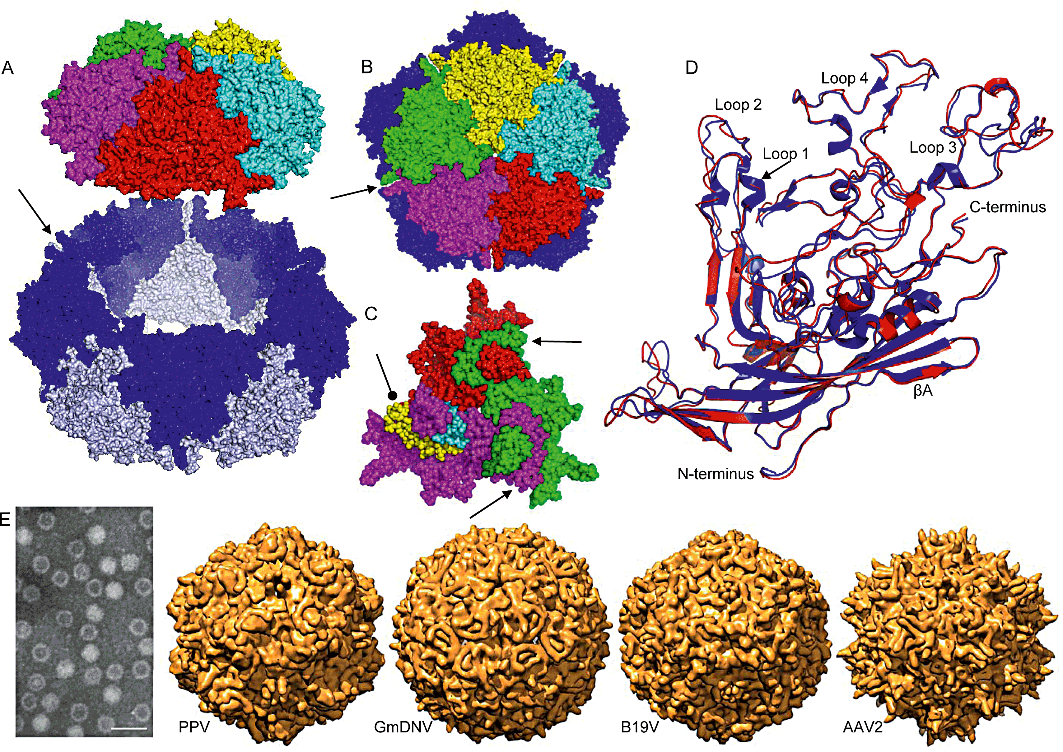 Figure 1 Morphology of parvoviruses. (A) Side-view, at a resolution of 3.5 , of a tilted model of a porcine parvovirus (PPV) capsid with the top five trimers translated 120 along its 5-fold axis from the middle body of 10 trimers (five shown in dark blue and five in light blue); the bottom five trimers are not shown. The 5-fold axes are located at the intersection of five trimers (e.g. at arrow: green, magenta, two dark blue and one light blue colored trimer). (B) Top view of model shown in (A), without light-blue trimers, along the 5-fold axis. The channels at the 5-fold axes are clearly visible (arrow indicates same 5-fold axis as shown by arrow in (A)). (C) Structure of a PPV trimer. The arrows indicate the intertwining of the GH-loop (between strands G and H) in the counter-clockwise located proteins from near the 3-fold axis towards the 2-fold axis (arrows). The GH-loop actually consists of two loops of which one (loop 3, yellow), running to the 2-fold axis, is partly covered by loop 4 (cyan) near the 3-fold axis (oval arrow). (D) Parvoviruses may have remarkably similar structures despite low sequence identities. This figure shows the alignment of minute virus of mice (MVM, in red; 549 amino acid residues, PDB 1mvm) and PPV (in blue; 542 amino acid residues, PDB 1k3v) structural proteins that have only 52% sequence identity. Nevertheless, 528 Cs (97%) of the residue pairs occupy the same position in the capsid (root-mean-square error of 1.0 ). (E) Negative contrast electron micrograph of empty and full PPV particles (bar=50 nm) and space-filling models of the capsid structures of PPV, Galleria mellonella densovirus (GmDNV; PDB: 1DNV), human B19 virus (B19V; PDB: 1s58), and adeno-associated virus - 2 (AAV-2; PDB: 1lp3) shown at a resolution of 4 . In each case, the view is down a 2-fold axis at the centre of the virus, with 3-fold axes left and right of centre, and 5-fold axes above and below. Models (A-D) have been rendered by PyMOL and the space-filling models by CHIMERA (Multiscale Models).