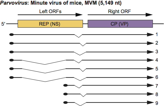 Figure 4 Gene organization and transcription scheme for members of the genus Parvovirus, as shown for minute virus of mice (MVM). Genes are shown as boxes. The left ends of the mRNAs (thick lines) are the sites of the mRNA caps (filled circles), the right ends are the polyadenylation sites (arrows); introns are indicated by thin lines.