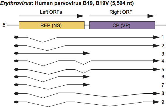 Figure 5 Gene organization and transcription scheme for members of the genus Erythrovirus, as shown for human parvovirus B19 (B19V). Genes are shown as boxes. The left ends of the mRNAs (thick lines) are the sites of the mRNA caps (filled circles), the right ends are the polyadenylation sites (arrows); introns are indicated by thin lines.