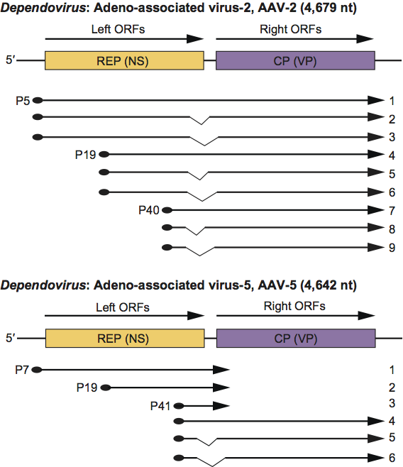 Figure 6 Gene organization and transcription scheme for members of the genus Dependovirus, as shown for adeno-associated virus 2 (AAV-2) and the nonprimate adeno-associated virus 2 (AAV-5). Genes are shown as boxes. The left ends of the mRNAs (thick lines) are the sites of the mRNA caps (filled circles), the right ends are the polyadenylation sites (arrows); introns are indicated by thin lines. In contrast to the primate AAVs, nonprimate AAVs also have a polyadenylation site in the middle of the genome. Both types of AAVs have 3 promoters.