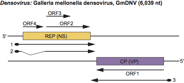 Figure 9 Gene organization and transcription scheme for members of the ambisense genus Densovirus, as shown for Galleria mellonella densovirus (GmDNV). Genes are shown as boxes as well as the ORFs that they contain. The starts of the mRNAs (thick lines) are the sites of the mRNA caps (filled circles), the ends are the polyadenylation sites (arrows); the intron is indicated by thin lines. ORF1 and ORF2/3 are translated by a leaky scanning mechanism from transcript 3 and 2, respectively.