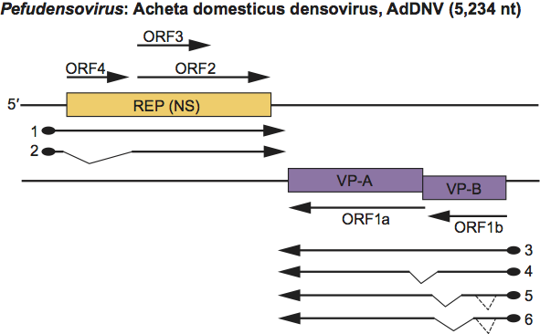 Figure 10 Gene organization and transcription scheme for members of the ambisense genus Pefudensovirus, as shown for Acheta domesticus densovirus (AdDNV). Genes are shown as boxes as well as the ORFs that they contain. The starts of the mRNAs (thick lines) are the sites of the mRNA caps (filled circles), the ends are the polyadenylation sites (arrows); the intron is indicated by thin lines. ORF1a/b and ORF2/3 are translated by a leaky scanning mechanism from transcript 4 and 2, respectively. Transcript 1 yields NS3 (ORF4), transcript 2 yields NS1 and NS2, transcript 3 yields VP2, transcript 4 yields VP1, VP3 and VP4 (possibly VP5), transcripts 5 and 6 yield also nonstructural proteins (ORF1b). There are some minor variations in the expression strategies of these viruses (e.g. an extra intron for Periplaneta fuliginosa densovirus (PfDNV) indicated by dashed lines).