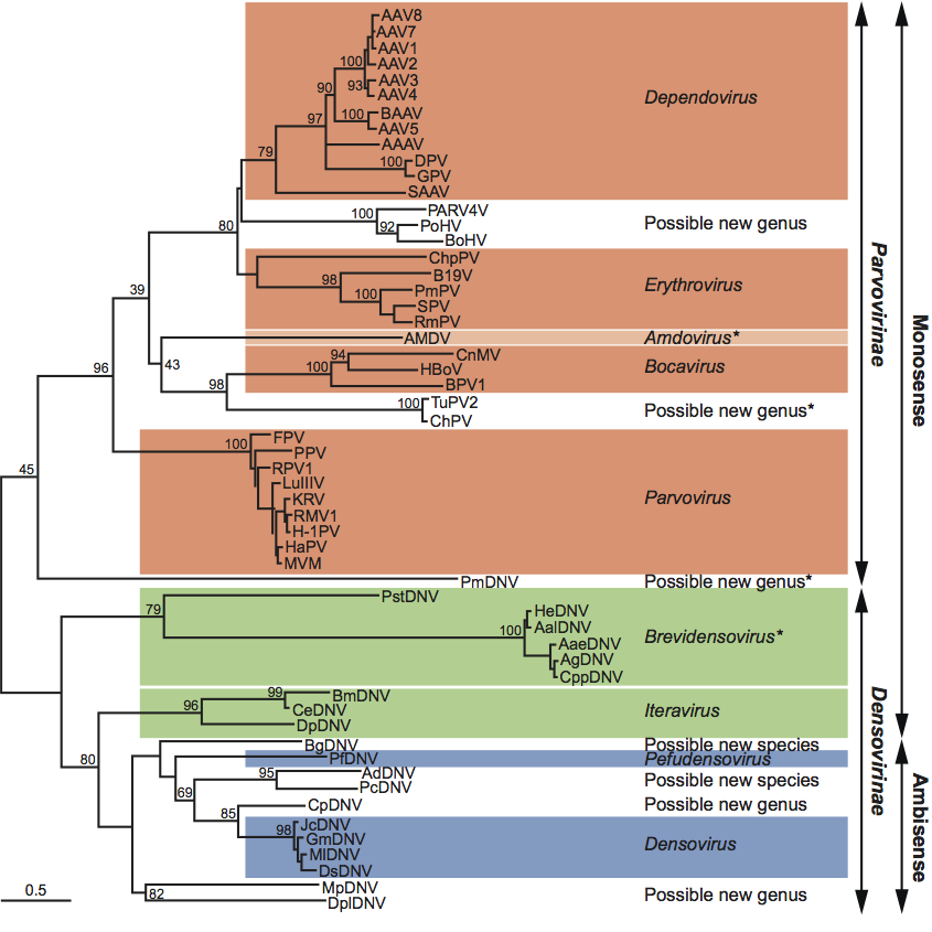Figure 11 Phylogenetic relationship among the pleiotropic NS1 proteins of members of the family Parvoviridae. The tree was constructed with the programs included in the Phylip package at the http://mobyle.pasteur.fr/cgi-bin/portal.py website (ClustalW-multialign, Phylip distance matrix, PROTDIST, Neighbor-Joining method, and phylogenetic tree drawing). The percentage of replicate trees in which the associated taxa clustered together in the bootstrap test (1000 replicates) are shown next to the branches. The scale bar represents the rate of amino acid substitutions. This phylogenetic analysis distinguishes the two subfamilies, as well as the monosense and ambisense densoviruses, and recognizes the different genera as separate clades. Several other clades that are possible new genera, as described in the text, are also recognized. The asterisk indicates clades of viruses that do not contain the phospholipase A2 motif in their capsid proteins.