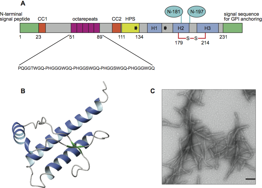 Figure 1 Organization and structural properties of the mouse prion protein. (A) Scheme of the organization of the mouse prion protein (numeration according to the human prion protein). In the mature form of the protein the N-terminal signal peptide (N-terminal green box) is cleaved off and the C-terminal peptide (C-terminal green box) is replaced by a GPI anchor at Ser-231. The N-terminal unstructured part of the protein contains five octarepeats (magenta boxes), two positively charged amino acid clusters CC1 and CC2 (orange boxes) and a highly conserved hydrophobic polypeptide segment comprising residues 111134 (yellow box). The folded C-terminal domain contains three -helices H1H3 (blue boxes) and a short antiparallel -sheet (indicated by two black arrows). Helices 2 and 3 are connected by a single disulfide bridge between Cys-179 and Cys-214. The protein also contains two potential glycosylation sites at amino acid positions 181 and 197 (light blue ellipses). (B) Three-dimensional structure of mPrP(121231). The three -helices are shown in blue and the antiparallel -sheet in green. (C) Electron micrographs of negatively stained recombinant mouse fibrils. The bar represents 100 nm.