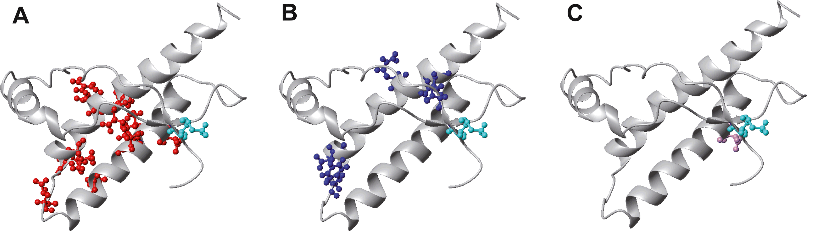 Figure 2 Location of point mutations in the three-dimensional structure of hPrP(121230) that are associated with familial prion diseases. The backbone is shown in grey and the side chains of the residues associated with the mutations for inherited fCJD are shown in red (A), for GSS in blue (B) and fFFI in magenta (C). The polymorphism at position 129 is indicated in green. The molecules were generated with the program MOLMOL.