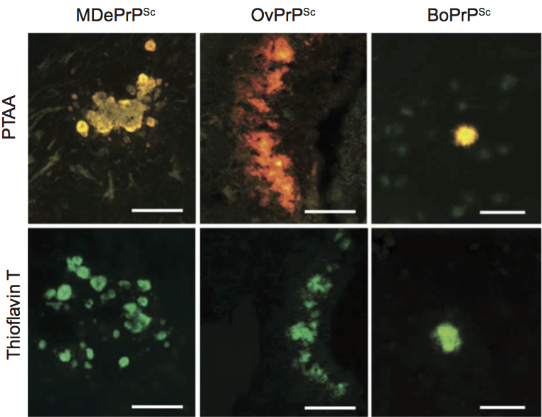 Figure 3 Comparison of images showing different prion strains stained with PTAA and Thioflavin T. (A) MDePrPSc, (B) OvPrPSc and (C) BoPrPSc prion deposits. PTAA-stained deposits appear in yellow-red. Scale bars represent 500 m.