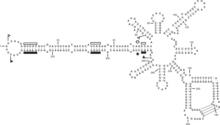Figure 5 Primary and proposed branched secondary structure of lowest free energy for the reference sequence variant of an isolate of peach latent mosaic viroid. Plus and minus self-cleavage domains are delimited by flags, the 13 conserved residues present in most of the hammerhead structures are indicated by bars, and the self-cleavage sites are shown by arrows. Solid and open symbols refer to plus and minus polarities respectively. In vitro chemical and enzymatic probing has revealed the probable existence of a kissing-loop interaction between residues GCGG and CCGC (position 178181 and 211214, respectively) (Bussire et al., 2000).