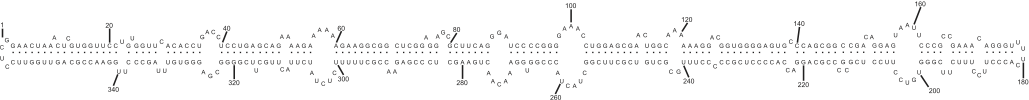 Figure 6 Primary and proposed rod-like secondary structure of lowest free energy for the reference sequence variant of potato spindle tuber viroid (PSTVd).