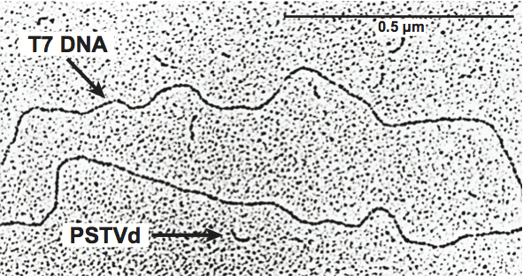 Figure 1 Electron micrograph of potato spindle tuber viroid (PSTVd) and viral DNA (coliphage T7 DNA) illustrating the comparative sizes and the rod-like structure of the viroid. The scale bar represents 0.5 m.