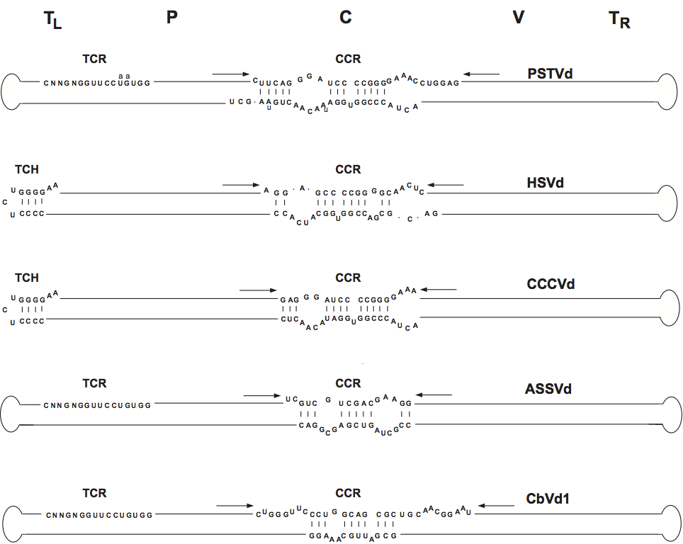 All viroids except ASBVd, PLMVd, CChMVd and eggplant latent viroid (ELVd) share a model of five structural functional domains within the proposed rod-like secondary structure of minimal free energy: C (central), P (pathogenic), V (variable) and TR and TL (terminal right and left). The C domain contains a central conserved region (CCR) formed by two sets of conserved nucleotides located in the upper and lower strands, with those of the upper strand being flanked by an inverted repeat (Figure 2).