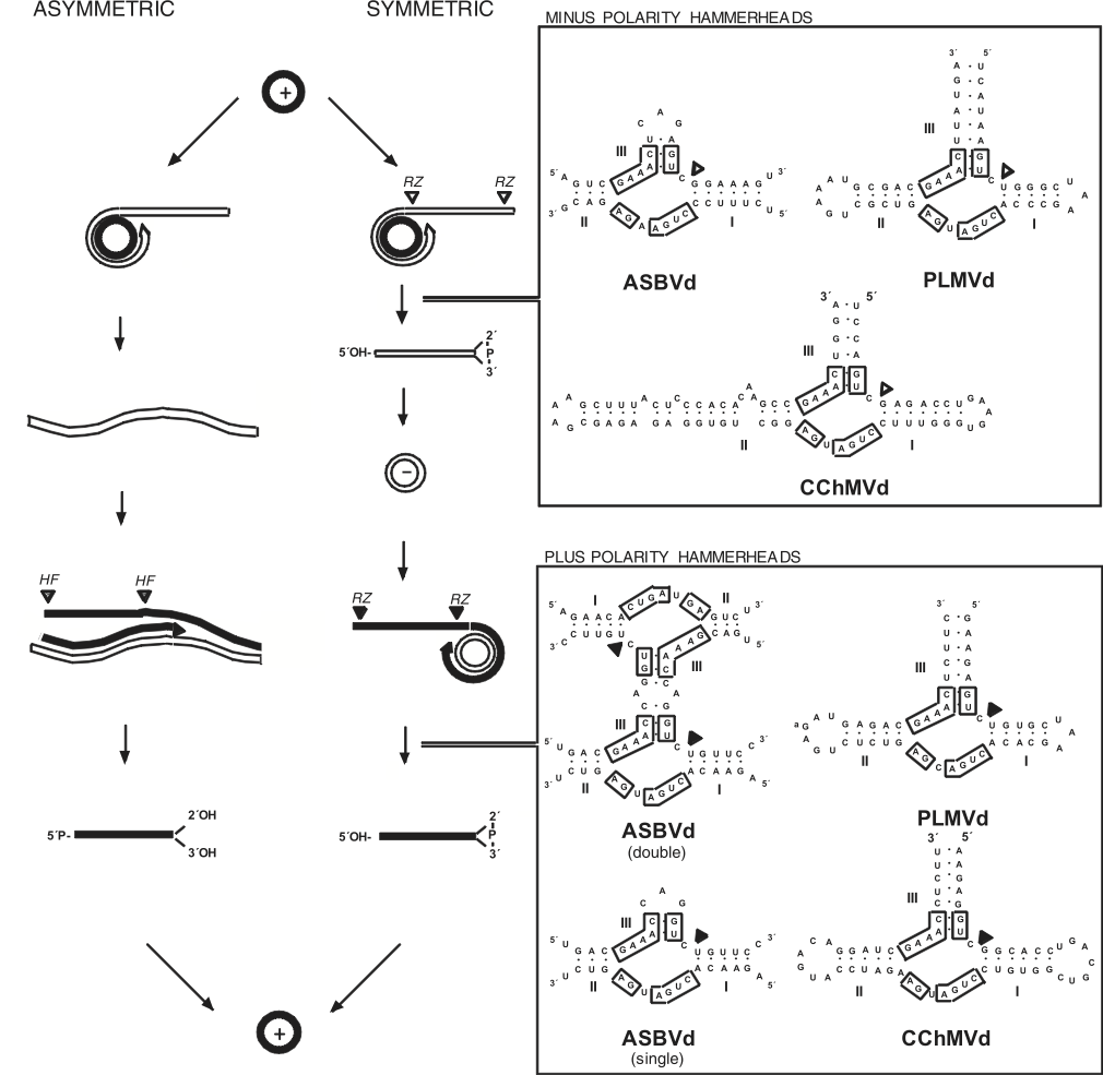 Figure 3 Models for viroid replication. The plus polarity (solid lines) is assigned by convention to the most abundant infectious RNA and the minus polarity (open lines) to its complementary strand. The alternative asymmetric and symmetric pathways involve one and two rolling circles, respectively. In the symmetric variant, cleavage of plus and minus multimeric strands is mediated by hammerhead ribozymes (RZ), which lead to linear monomeric RNAs with 5-hydroxyl and 2-3-cyclic phosphodiester termini. Arrowheads denote the cleavage sites. The hammerhead structures that can be formed by avocado sunblotch viroid (ASBVd), peach latent mosaic viroid (PLMVd) and chrysanthemum chlorotic mottle viroid (CChMVd) RNAs are shown on the right; conserved nucleotides are boxed. In the asymmetric variant, cleavage of plus multimeric strands relies on a host factor (HF), which generates linear monomeric RNA containing probably 5-phosphomonoester and 2 and 3-hydroxyl termini.