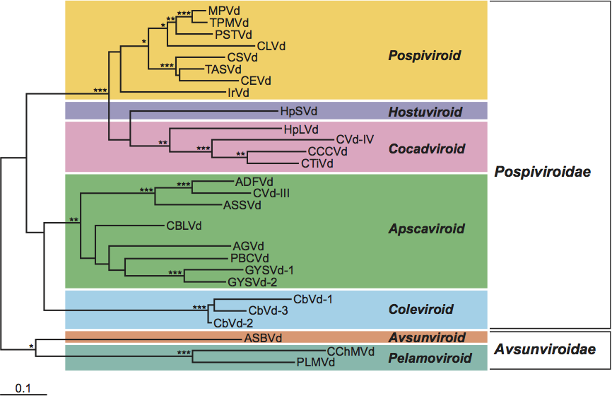 Figure 4 Consensus phylogenetic tree (based on 1000 replicates) obtained for viroids. Isolates indicated by ***, ** and * form monophyletic groups in more than 95%, 85% and 75% of the replicates, respectively. Numbering of sequences was based on the similarities found between the upper strands of the central conserved regions of members of the family Pospiviroidae and the upper-left-hand portions of the hammerhead structures of members of the family Avsunviroidae (Diener, T.O. (1991) Subviral pathogens of plants: viroids and viroidlike satellite RNAs. FASEB J., 5, 28082813). The alignment was performed with the Clustal X program, version 1.64 (gap opening and gap extension penalties 15 and 1, respectively) and minor manual adjustments between the conserved regions. Evolutionary distances were estimated according to the model of Jukes and Cantor and the phylogenetic tree was constructed by the neighbor-joining method using the MEGA program (version 1.01). (De la Pea and Flores, unpublished data.)